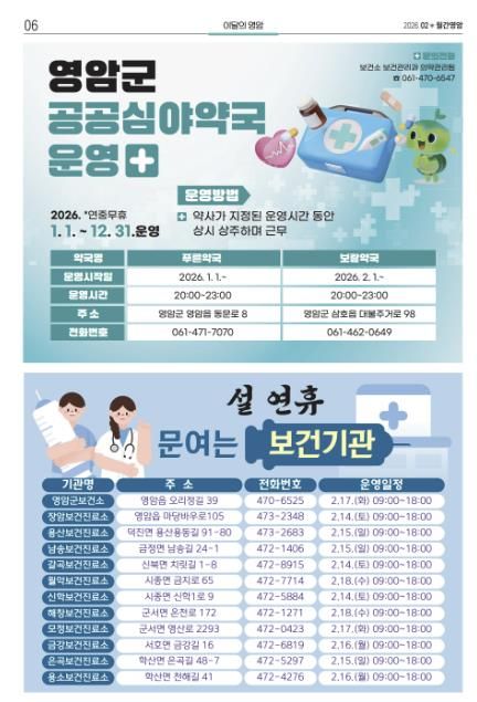 설 명절 연휴 기간 문 여는 병·의원과 약국은 영암군 반상회보 ‘월간영암’ 2월호, 영암군홈페이지 열린군정'영암소식'반상회보(월간영암)에서 볼 수 있다.