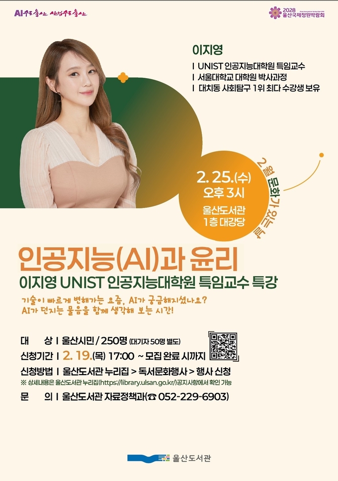 [경남도민뉴스=최재경 기자] 울산도서관은 오는 2월 25일 오후 3시 도서관 1층 대강당에서 2월 문화가 있는 날 행사로 이지영 유니스트(UNIST) 특임교수를 초청해 ‘인공지능(AI)과 윤리’ 특강을 개최한다고 밝혔다.