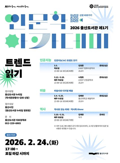[경남도민뉴스=최재경 기자] 울산도서관은 오는 3월부터 ‘2026년 제1기 인문학 아카데미’를 운영한다고 밝혔다.