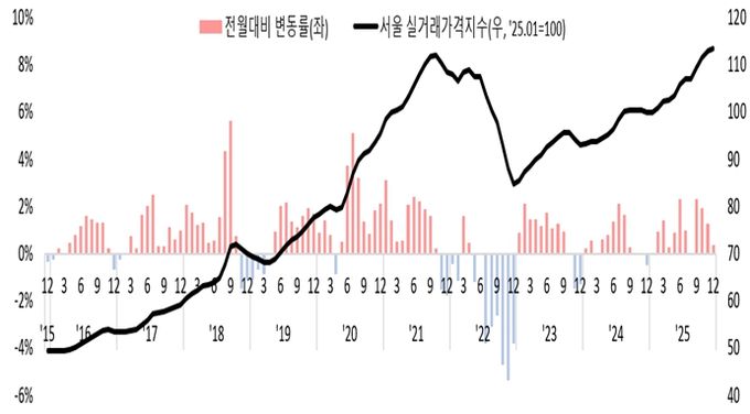 장기 주택가격 추이를 살펴보면 서울 아파트 실거래가는 2021년 10월 정점을 찍은 후 2022년 12월까지 하락했으나, 2023년 이후 현재까지 꾸준한 상승세를 유지하고 있다. 특히 2025년은 팬데믹 시기 초저금리(0.5~1%), 유동성 확대 영향으로 주택가격이 급등했던 2021년 이후 최대치인 13.5%까지 연간 상승률이 급등했다.