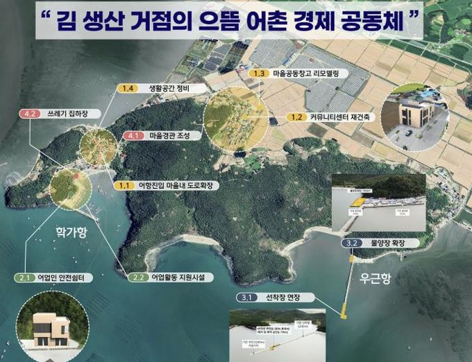 주요사업은 ▶생활기반시설 확충(마을내 도로확장, 커뮤니티센터 재건축) ▶안전관리 (어업인 안전쉼터, 교통 안전시스템 구축) ▶어항정비 (선착장 연장, 물양장 확장) ▶청정환경 마을경관조성(쓰레기 집하장) ▶주민역량 강화 등이 추진된다.