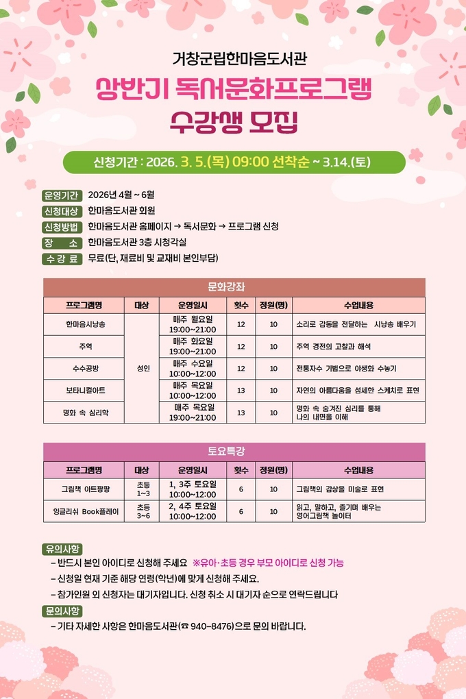 [경남도민뉴스=백형찬 기자] 거창군 한마음도서관은 오는 3월 5일부터 군민들의 지적 욕구를 충족시키고 문화적 소양을 높이기 위한 ‘상반기 독서문화 프로그램’ 수강생을 모집한다.