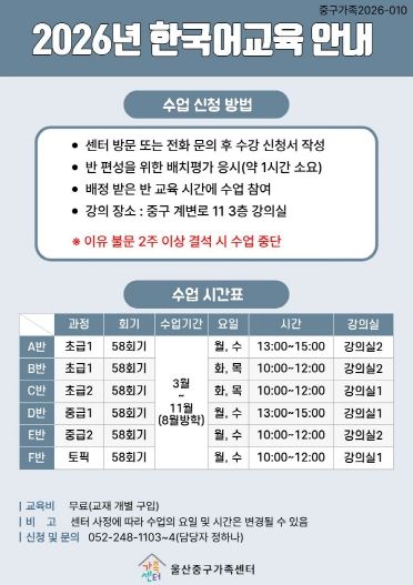 [경남도민뉴스=최재경 기자] 울산중구가족센터(센터장 서선자)가 2026년 결혼이민자 역량강화 지원사업의 일환으로 ‘한국어 교육 과정’을 운영한다.