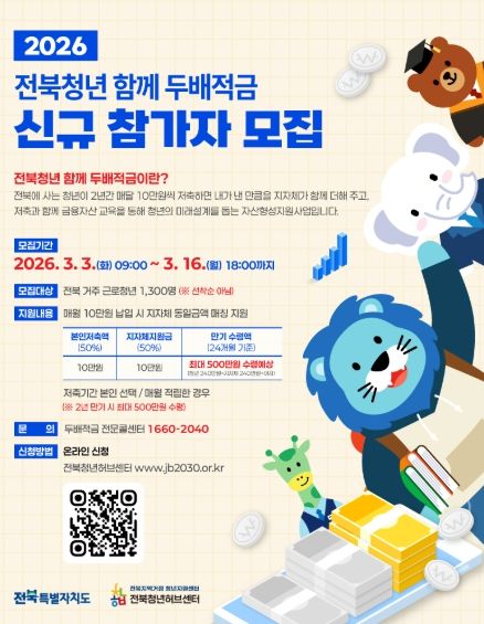 2년 만기 ‘전북청년 함께 두 배 적금’은 매월 10만 원 납부 시 지자체에서 10만 원을 추가로 적립해 주는 방식으로, 만기 시 본인 저축액의 두 배인 480만 원과 이자를 함께 받을 수 있다.