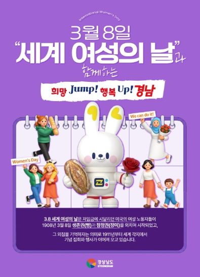 [경남도민뉴스=구인애 기자] 경상남도는 3월 8일 세계 여성의 날을 맞아 여성의 사회 참여 확대와 양성평등 사회 실현을 위한 다양한 정책을 추진하고 있다고 밝혔다.