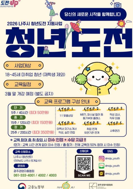 [경남도민뉴스=최인태 기자] 전남 나주시는 구직 활동에 어려움을 겪는 청년들의 취업 의욕을 높이고 사회 진출을 돕기 위해 맞춤형 취업역량 프로그램인 ‘청년도전지원사업’ 참여자를 모집한다고 6일 밝혔다.