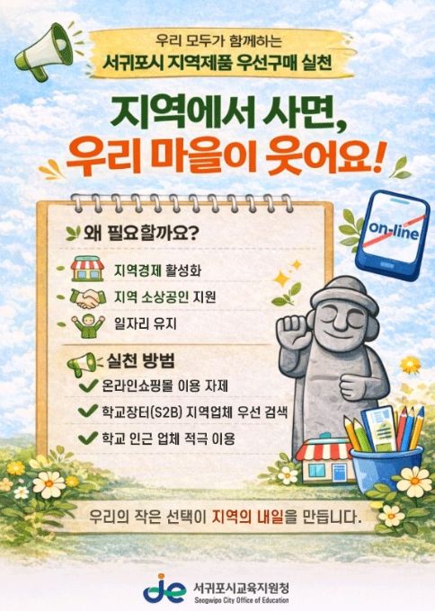 특히 서귀포시교육지원청은 지난해 시범사업을 연중 상시 추진 체계로 전환하고 3~6월을 ‘신학기 집중 구매 기간’으로 지정해 지역업체 물품을 우선 구매하며 학교장터(S2B)와 제주 전용 ‘혼저옵써 에듀몰’을 적극 활용해 계약의 투명성과 지역업체 검색·계약 편의성을 높일 예정이다.