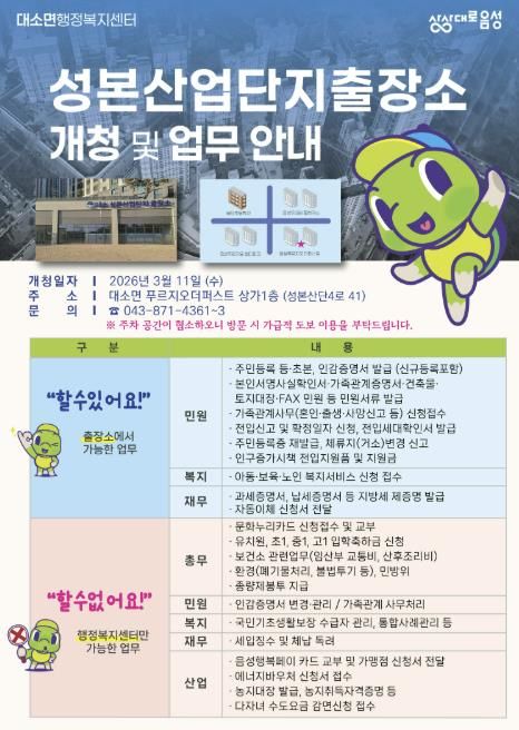 아울러 군은 향후 성본산단 인구 증가와 행정 수요 확대에 대비해 신축 출장소 건립도 중장기적으로 추진할 계획이다.