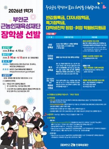 [경남도민뉴스=최인태 기자] 부안군 근농인재육성재단은 2026년 1학기 장학생 신청 접수를 위해 각종 홍보자료를 준비하고 온라인 신청 시스템을 정비하는 등 장학생 선발 준비를 모두 마쳤다고 전했다.