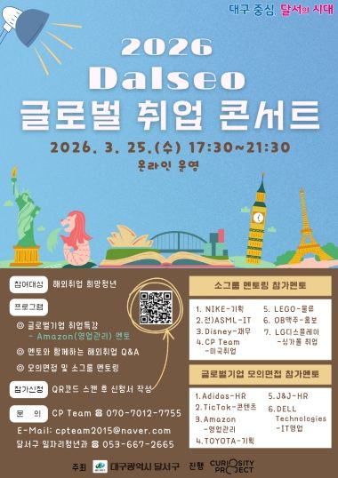 [경남도민뉴스=백상현 기자] 대구 달서구는 해외취업을 희망하는 청년들의 글로벌 역량을 강화하고 해외 진출 기회를 확대하기 위해 3월 25일‘2026년 Dalseo 글로벌 취업콘서트’를 온라인으로 개최한다.