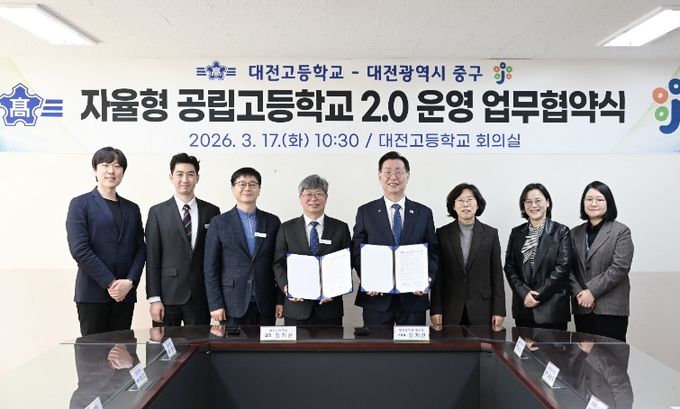 [경남도민뉴스=도문호 기자] 대전 중구는 17일 대전고등학교(교장 김기신)와 지역교육 기반 강화를 위한 상호교류 협력 협약을 체결하고, 지역과 학교가 유기적으로 소통하며 함께 성장하는 교육공동체 구축에 나섰다고 밝혔다.