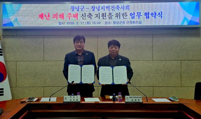 [경남도민뉴스=김병현 기자] 창녕군과 창녕지역건축사회(회장 김태헌)는 지난 17일 군청 군정회의실에서 ‘재난 피해 주택 신축 지원 업무협약’을 체결했다고 밝혔다.