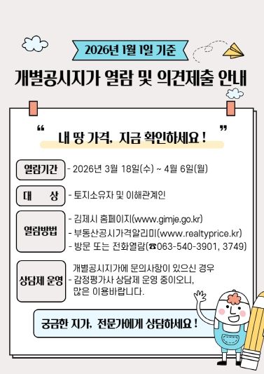 [경남도민뉴스=최인태 기자] 김제시는 2026년 1월 1일 기준으로 조사․산정한 개별공시지가 총 307,692필지에 대해 18일부터 오는 4월 6일까지 열람 및 의견 접수를 실시한다고 밝혔다.