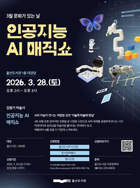 [경남도민뉴스=최재경 기자] 울산도서관은 오는 3월 28일 오후 2시 도서관 1층 대강당에서 3월 문화가 있는 날 행사로 ‘인공지능(AI) 마술(매직)쇼’ 공연을 개최한다고 밝혔다.