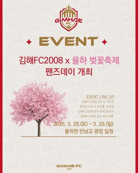 [경남도민뉴스=최미정 기자] 김해FC2008이 오는 28일 ‘제7회 율하 벚꽃축제’ 현장에서 팬들과 직접 소통하는 ‘팬즈데이’를 개최한다고 밝혔다.
