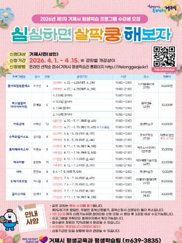 [경남도민뉴스=김부경 기자] 거제시는 4월 1일부터 4월 15일까지 ‘심쿵해 (심심하면 살짝쿵 해보자)’평생학습 프로그램 수강생을 선착순으로 모집한다고 밝혔다.