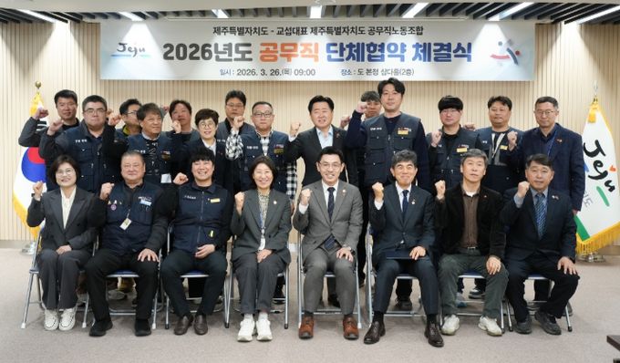 [경남도민뉴스=하형수 기자] 제주특별자치도와 교섭대표 노동조합인 제주도 공무직노동조합이 26일 도청 삼다홀에서 ‘2026년도 공무직 단체협약’을 체결했다.