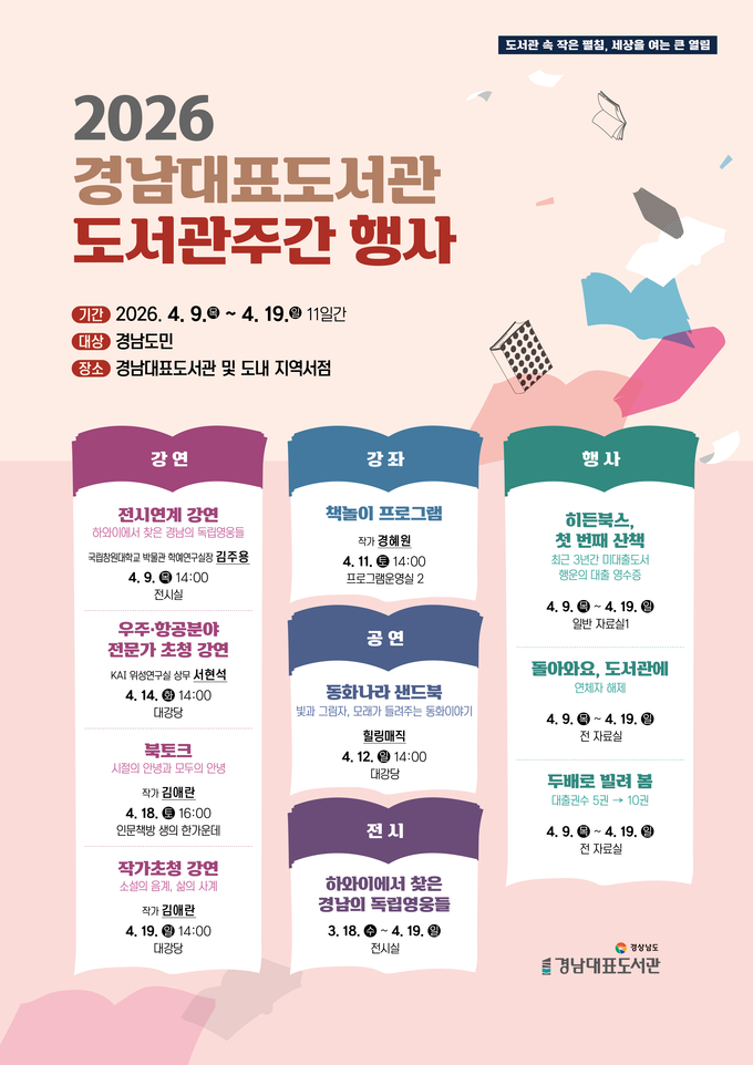 [경남도민뉴스=구인애 기자] 경남대표도서관은 제62회 도서관주간을 맞아 4월 9일부터 19일까지 도민들을 위한 다양한 독서문화 행사를 진행한다고 밝혔다.