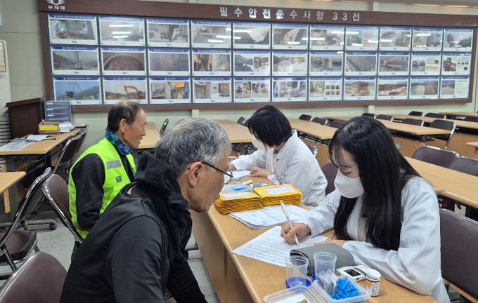 이번 상담실은 신원면 도로건설 현장에서 근무하는 65세 이상 근로자를 대상으로 운영됐으며, 현장 근로자들이 업무 특성상 병원 방문이나 정기적인 건강관리가 쉽지 않아 고혈압·당뇨 등 심뇌혈관질환 선행 질환을 인지하지 못하는 경우가 많다는 점을 고려했다.