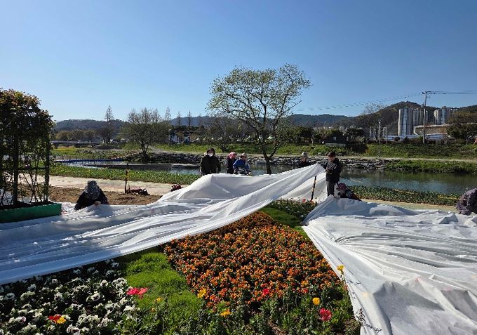 특히 꽃강길 일원에 식재된 초화류는 저온과 외부 환경 변화에 매우 민감해 일시적인 기온 저하에도 생육 저하나 꽃잎 손상으로 이어질 수 있어, 군은 서리 피해가 우려되는 주요 구간을 중심으로 부직포를 활용한 보온·보호 조치를 신속히 시행했다.
