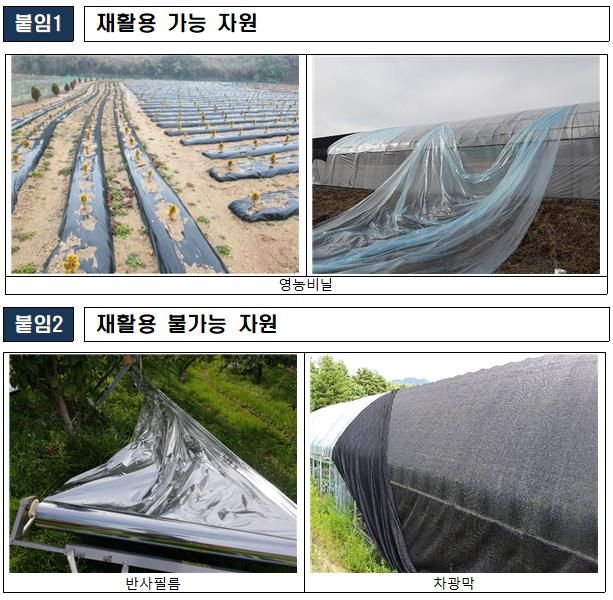 다만, 반사필름, 차광막, 부직포, 곤포사일리지 필름, 비료포대 등은 재활용이 불가능한 자원으로 이번 수거 대상에서 제외되므로 배출 시 주의가 필요하다.