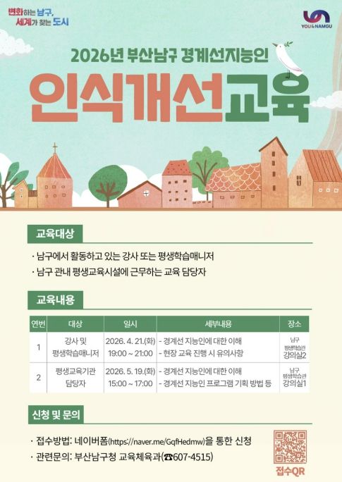 교육은 강사, 매니저, 관계기관 담당자 등 평생교육 관계자를 대상으로 진행된다. 주요 내용은 ▲경계선지능인의 개념과 특성 ▲효과적인 소통 방법 ▲맞춤형 평생교육 프로그램 기획 방법 등이다. 교육 신청은 네이버폼 또는 남구 교육체육과를 통해 가능하다.