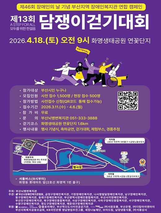 [경남도민뉴스=신석주 기자] 부산시는 장애인의 날(4.20.)을 맞이해 내일(18일) 오전 9시 화명생태공원에서 '제13회 담쟁이 걷기대회'가 열린다고 밝혔다.