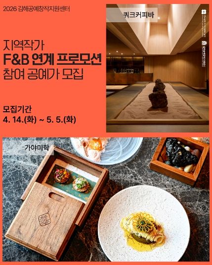 [경남도민뉴스=최미정 기자] (재)김해문화관광재단클레이아크김해미술관에서 운영하고 있는 김해공예창작지원센터는 '지역작가 F·B 연계 프로모션'에 참여할 공예가 모집을 지난 14일부터 시작해 오는 5월 5일(화)까지 진행한다고 밝혔다.