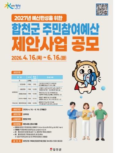 [경남도민뉴스=김춘호 기자] 합천군은 2027년도 예산편성을 위한 주민참여예산 제안사업 공모를 6월 16일까지 실시하며, 올해부터 공모 분야를 기존 1개 모델 3개 유형에서 3개 모델 5개 유형으로 확대 개편한다고 밝혔다.