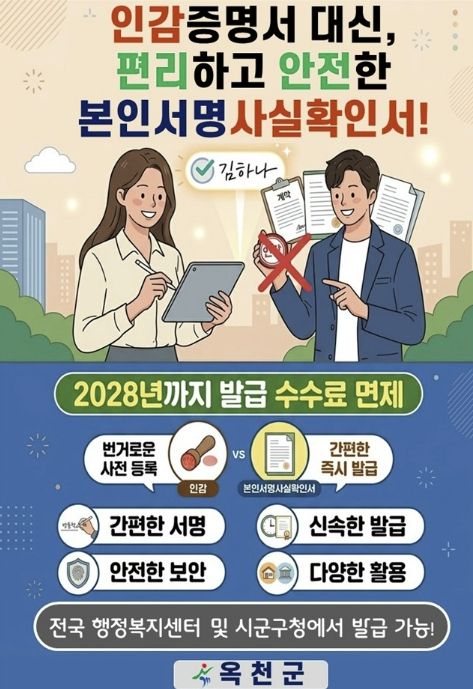 [경남도민뉴스=박만수 기자] 옥천군이 인감도장 없이도 간편하게 발급받을 수 있는 ‘본인서명사실확인서’ 이용 활성화에 나서며 군민들의 민원 편의 향상에 박차를 가한다. 특히 2028년까지 수수료 면제 혜택과 함께 전자발급 등 비대면 서비스까지 확대되면서 보다 쉽고 안전한 행정서비스 이용 환경이 마련될 것으로 기대된다.