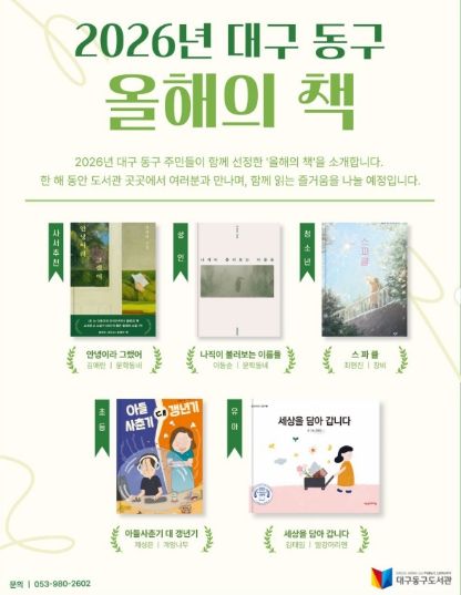 (재)대구동구문화재단 관계자는 “올해의 책 사업을 통해 지역 주민이 함께 읽고 소통하는 문화가 더욱 확산되기를 기대한다”며 “이번 선포식과 작가 강연이 책을 매개로 한 공감과 교류의 장이 되길 바란다”고 전했다.