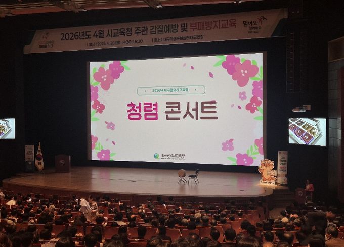 [경남도민뉴스=백상현 기자] 대구시교육청은 4월 20일 오후 2시 30분부터 대구학생문화센터 대공연장에서 교직원 및 관리자 등을 대상으로 ‘청렴콘서트’를 개최했다.