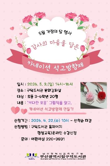 [경남도민뉴스=김채연 기자] 부산광역시립구덕도서관은 다음달 3일 도서관 문화강좌실에서 초등학교 3~6학년 20명을 대상으로 ‘감사의 마음을 담은 카네이션 석고방향제’ 체험을 운영한다.