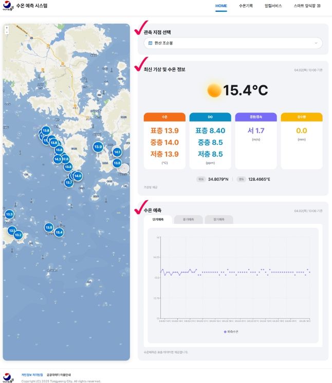 이번 서비스는 통영시 산양, 욕지, 한산 등 해황정보측정장치가 설치된 29개소 정점에 대해 민간클라우드 기반으로 해양·기상 데이터를 수집·정제·축적해 데이터레이크를 구축하고, 이를 활용한 AI 분석을 통해 고수온 발생 가능성을 사전에 예측하는 것이 핵심이다.
