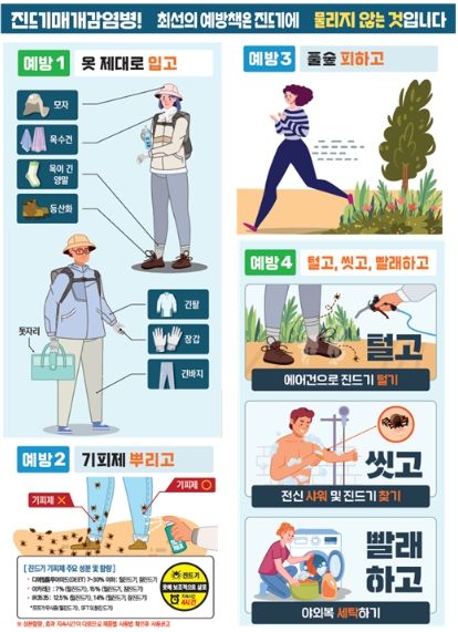 진드기 매개 감염병을 예방하기 위해서는 야외활동 시, 긴 옷과 팔토시, 장화 등을 착용해 피부 노출을 최소화하고, 작업 중 3~4시간마다 기피제를 뿌려야 한다. 특히, 풀밭에 앉거나 눕지 않고, 귀가 즉시 옷을 세탁하고 목욕을 하는 등 예방수칙을 준수하는 것이 중요하다.