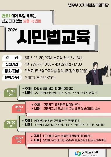 [경남도민뉴스=박민호 기자] 창원특례시 진해도서관(과장 이영화)은 오는 5월 매주 수요일 저녁 7시에 시민의 법률 이해도 향상과 일상 속 법적 문제 대응을 돕기 위해 ‘2026년 시민법교육’을 운영한다고 밝혔다.