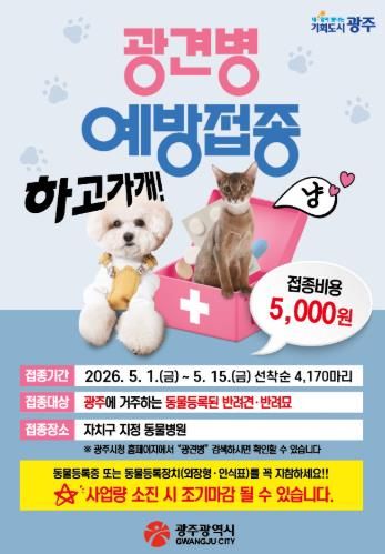 [경남도민뉴스=최현인 기자] 광주광역시는 반려동물과 시민의 건강을 지키기 위해 5월 1일부터 15일까지 ‘봄철 광견병 예방접종 사업’을 추진한다.