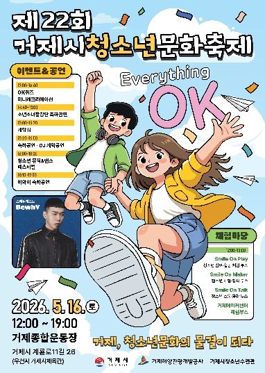 [경남도민뉴스=김부경 기자] 거제시는 오는 2026년 5월 16일 12:00~19:00, 거제종합운동장(우천 시 거제시체육관)에서 제22회 거제시청소년문화축제 “Everything OK”를 개최한다.