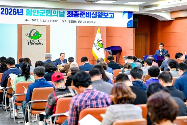 [경남도민뉴스=권중환 기자] 함안군은 함안군민의 화합 대축제인 ‘2026년 함안군민의 날’ 행사가 오는 5월 1일부터 3일까지 3일간 함안공설운동장과 함주공원 일원에서 열리는 가운데, 행사의 성공적인 개최를 위한 ‘2026년 함안군민의 날 최종 준비상황 보고회’를 지난 22일 군청 3층 대회의실에서 개최했다고 밝혔다.