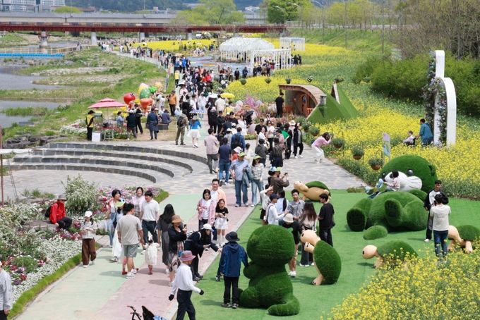 이번 봄꽃 축제는 ‘봄꽃야행’을 주제로, 벽라교에서 삼천교까지 이어지는 2.1km 구간, 총 6ha 규모의 꽃강길을 중심으로 펼쳐지고 있다. 유채를 비롯한 다양한 봄꽃과 조형물이 어우러져 낮과 밤 모두 색다른 경관을 선사하는 것이 특징이다.