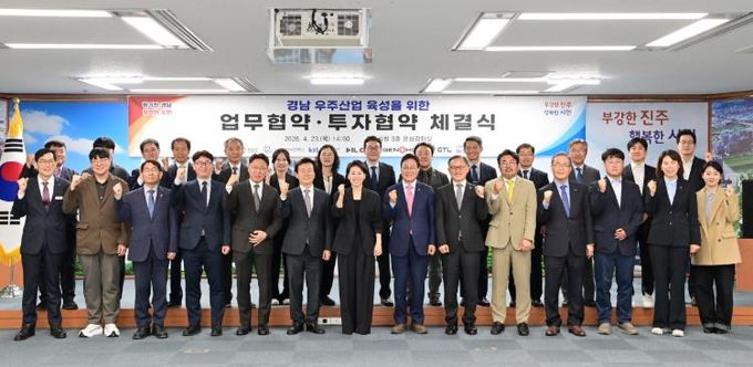 [경남도민뉴스=권중환 기자] 경상남도와 진주시는 23일 진주시청 문화강좌실에서 경상국립대학교, 한국산업기술시험원(KTL), 우주 분야 기업 4개 사와 함께 경남 우주산업 육성을 위한 업무협약 및 투자협약을 체결했다.