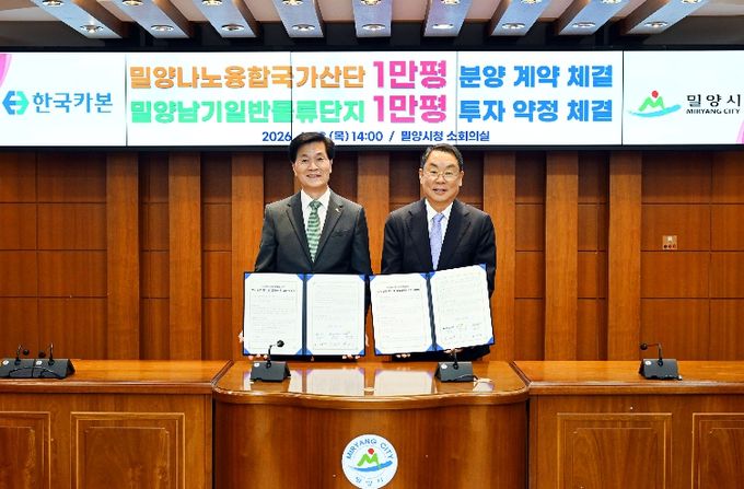 [경남도민뉴스=나희준 기자] 경남 밀양시는 23일 시청 소회의실에서 ㈜한국카본, 한국토지주택공사 경남지역본부와 함께 ‘밀양나노융합국가산업단지 부지분양 계약 및 밀양남기일반물류단지 투자약정’을 체결했다.