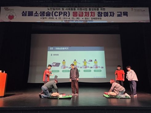 [경남도민뉴스=최미정 기자] (재)김해시복지재단 김해시니어클럽(김해노인일자리창출지원센터)에서는 지난 22일부터 23일까지 이틀간 김해문화원 공연장에서 노인일자리 노인역량활용사업 참여자를 대상으로 ‘심폐소생술(CPR) 응급처치 교육’을 실시했다.
