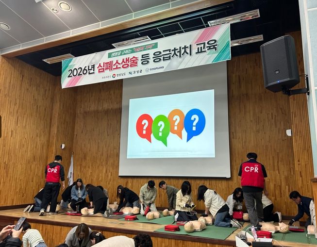 [경남도민뉴스=김태수 기자] 고성군은 4월 23일부터 24일까지 이틀간 고성군농업기술센터 2층 친환경농업연구소 강당에서 법정의무교육대상자 등 100여 명을 대상으로 ‘2026년 심폐소생술 등 응급처치 교육’을 실시했다.