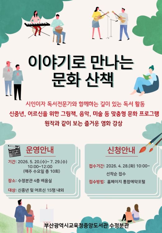 [경남도민뉴스=김채연 기자] 부산광역시립중앙도서관은 오는 5월 20일부터 7월 29일까지 매주 수요일마다 중앙도서관 수정분관에서 신중년 및 어르신 15명을 대상으로 ‘이야기로 만나는 문화 산책’ 프로그램을 운영한다.