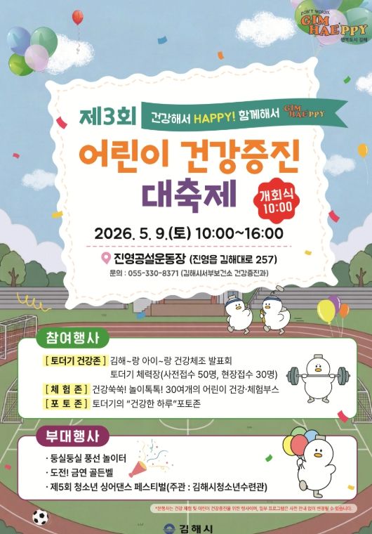 [경남도민뉴스=최미정 기자] 김해시서부보건소는 오는 5월 9일 진영공설운동장에서 관내 영유아와 초등학생, 가족 등 2,000여 명을 대상으로 ‘제3회 어린이 건강증진대축제’를 개최한다고 밝혔다.