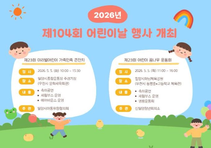 [경남도민뉴스=나희준 기자] 경남 밀양시가 제104회 어린이날을 맞아 아이들에게는 꿈과 희망을, 가족에게는 따뜻한 추억을 선물할 다채로운 축제의 장을 마련한다.