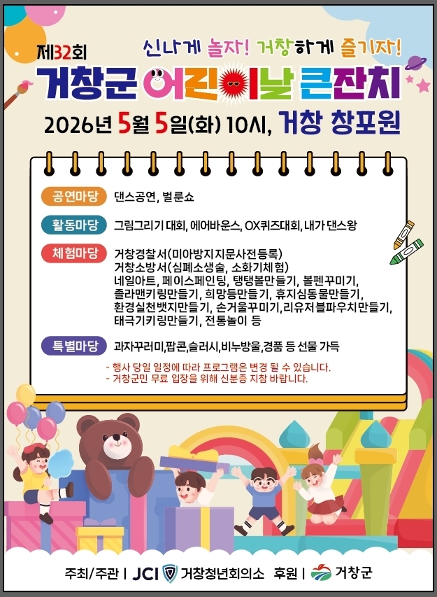 이번 행사는 거창청년회의소가 주관하며, 오전 10시부터 오후 3시까지 다채롭고 풍성한 프로그램으로 어린이와 가족 모두에게 특별한 하루를 선사할 예정이다.