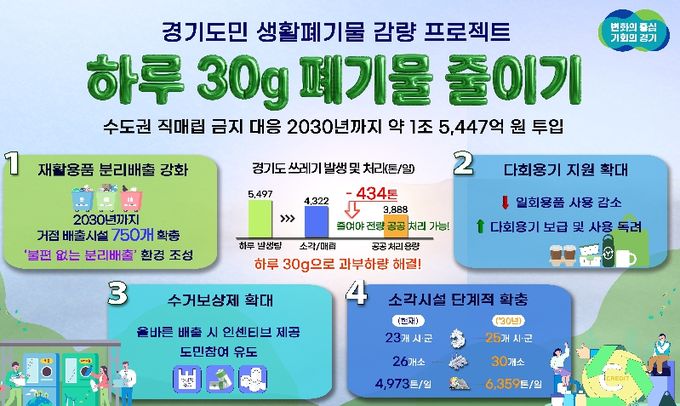[경남도민뉴스=김동규 기자] 수도권 직매립 금지에 따른 생활쓰레기 감량을 위해 경기도가 2030년까지 5년간 약 1조 5,447억 원을 투입하는 ‘하루 30g, 도민실천형 생활폐기물 감량 프로젝트’를 추진한다.