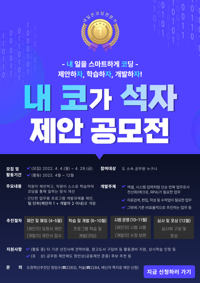 [경남도민뉴스] 경상남도가 올해 공무원 제안제도로 간단한 업무용 프로그램을 자체 개발하는 ‘내 코가 석자’ 제안 공모전을 개최한다.